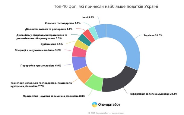 Больше всего налогов заплатили ФОПы, занимающиеся оптовой и розничной торговлей (11,6 млрд грн), работающие в сфере информации и телекоммуникаций (7,8 млрд грн) и профессиональной и научной деятельностью (3,3 млрд грн).
