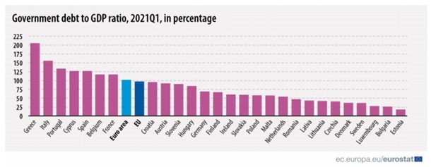 Самое высокое соотношение госдолга к ВВП на конец первого квартала 2021 года зафиксировали в Греции (209,3%), Италии (160,0%), Португалии (137,2%), Кипре (125,7%), Испании (125,2%), Бельгии (118,6%) и Франции (118,0%), а самый низкий в Эстонии (18,5%), Болгарии (25,1%) и Люксембурге (28,1%).