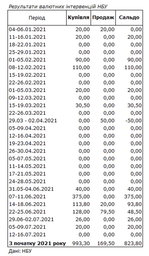 С начала 2021 года НБУ купил на межбанке 993,30 млн долларов и продал 169,50 млн долларов. Сальдо интервенций составило 823,80 млн долларов.