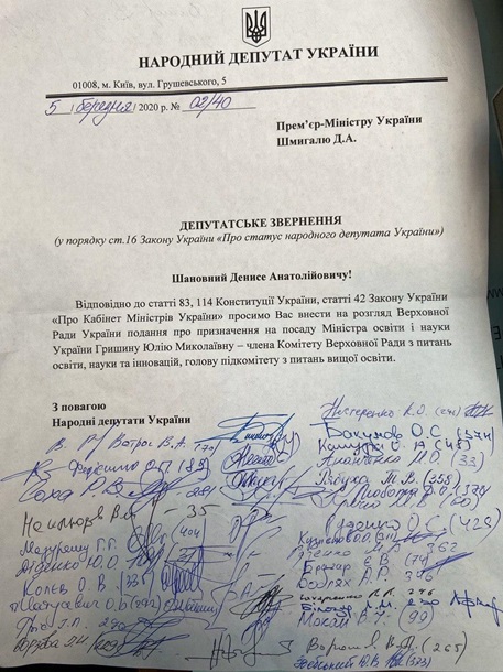 «Фракция Слуга народа видит доктора наук, коллегу по парламенту Юлию Гришину новым министром образования. Сейчас идет сбор подписей», — отметил он.