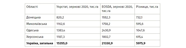 «Наибольшее количество неучтенных площадей наблюдается на территориях отведенных для выращивания зерновых в Донецкой (732,1 тыс га) и Одесской (1047,6 тыс га) областях. Общая разница посевных площадей зерновых по всей Украине составляет примерно 5975,9 тыс га», — говорится в сообщении.